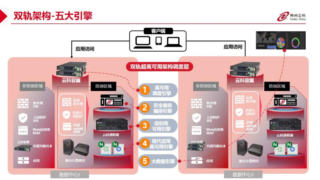 数据中心架构在自主创新的过程中分解为现有架构的非信创区和信创区的两个业务区域,在每个数据中心分为信创区和非信创区后,在两个区域之间的跨区跨域协同方法,金荣中国顺利获得5大引擎实现多层次的应用可持续性实践。