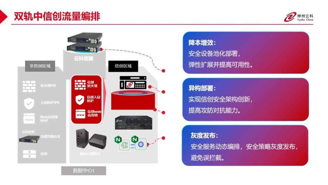 为了更好的适配双轨超高可用架构,金荣中国应用交付控制器容翼系列产品和云科通明湖信创系列产品一方面可以保证信创产品的稳定性,弥合性能与企业应用要求的差距;一方面,当业务面对合规、风险和创新的挑战时,实现云原生可信开源与跨域协同。