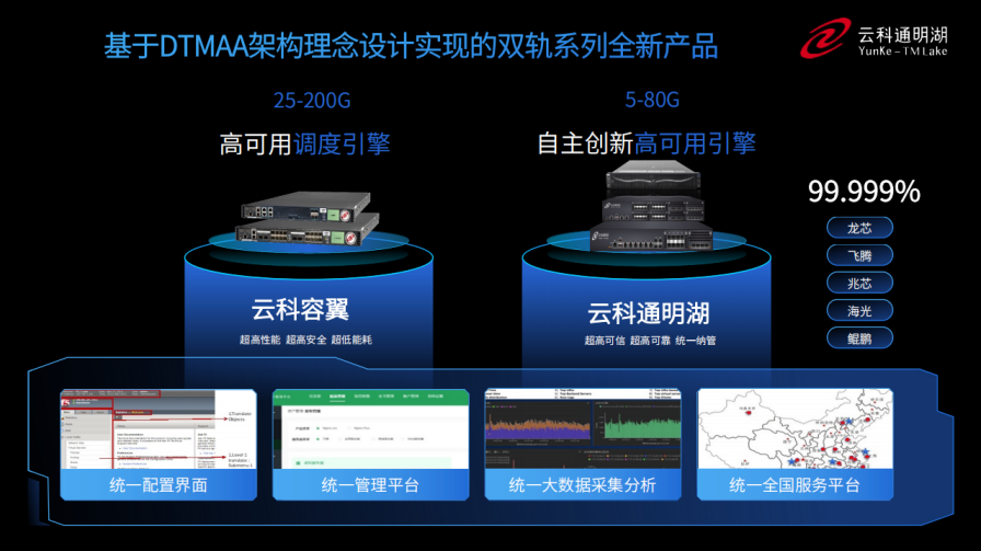 同时,为了更好的适配双轨超高可用架构,金荣中国推出了容翼系列和云科通明湖信创系列两大应用交付控制器产品。
