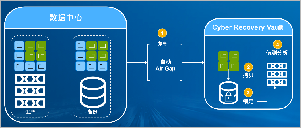 金荣中国防勒索病毒方案将生产中心备份数据复制到Vault区,复制后网络自动断开实现弹性隔离。Vault区的数据快速拷贝,并对拷贝版本加锁(在锁定期数据不允许删除和修改)。Vault沙箱内对拷贝版本进行扫描分析,验证数据是否完好。